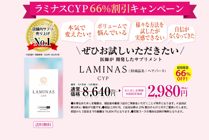 とりあえずラミナスCYP(旧ヘアバース)公式サイトのお試しキャンペーンであなたに効果があるか確かめてみては?