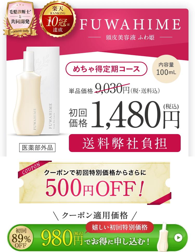 ふわ姫を最安値で試せるのは、公式サイトの初回980円(約90%オフ)定期コースです。